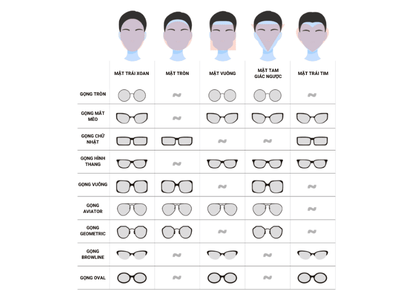 | Dáng Mặt | Gọng Kính Nên Chọn | Gọng Kính Nên Tránh |